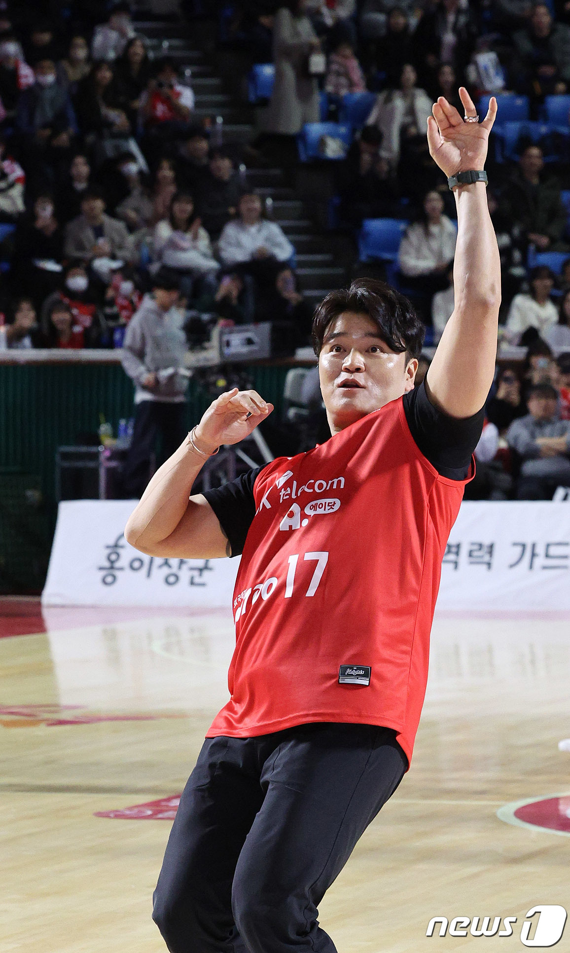 (서울=뉴스1) 장수영 기자 = 25일 오후 서울 송파구 잠실학생체육관서 열린 '2023-2024 정관장 프로농구' 서울 SK와 서울 삼성의 경기에 앞서 SSG랜더스 추신수가 시투하고 있다. 2023.12.25/뉴스1