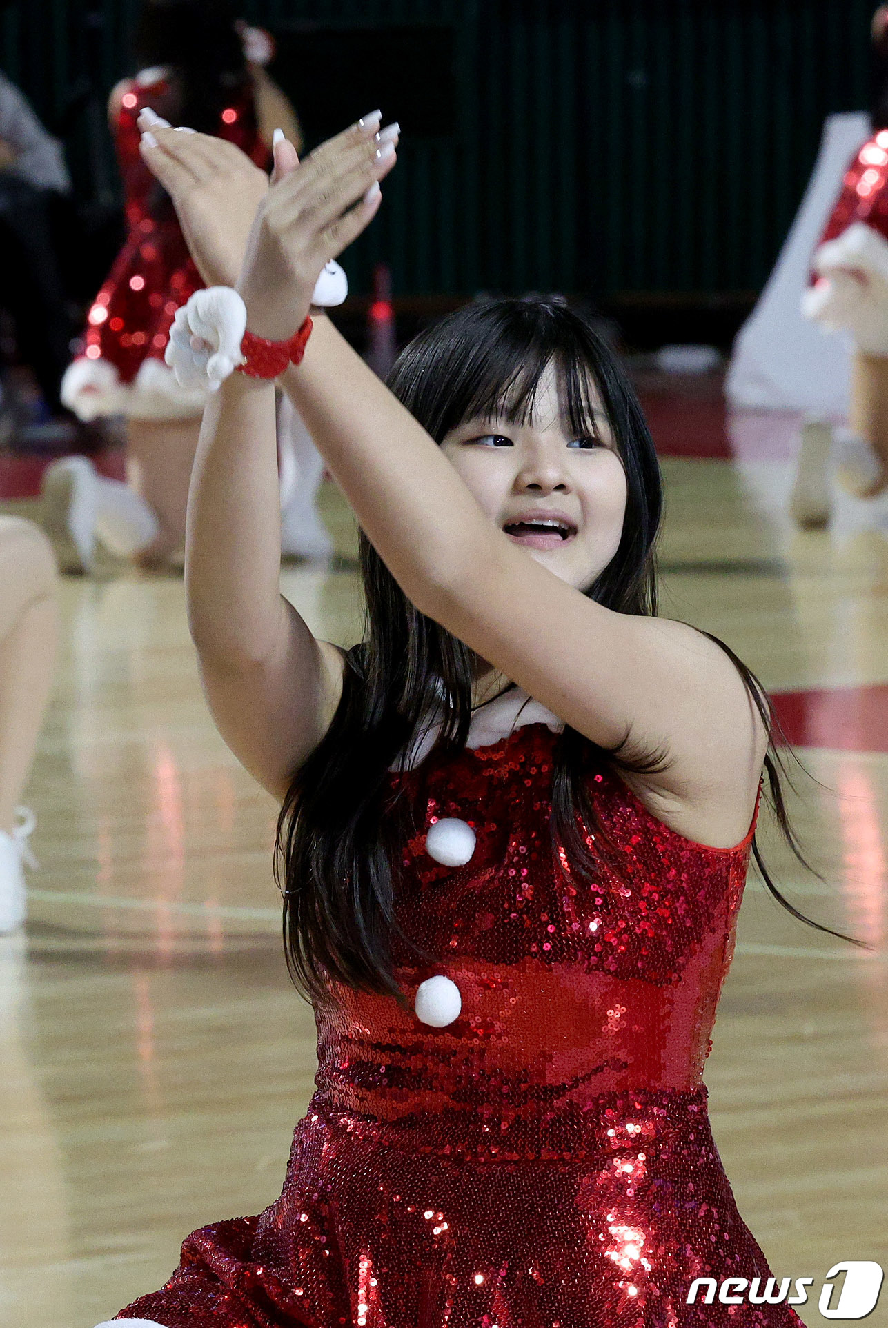 (서울=뉴스1) 장수영 기자 = 25일 오후 서울 송파구 잠실학생체육관서 열린 '2023-2024 정관장 프로농구' 서울SK와 서울 삼성의 경기에서 추신수 딸 추소희 양이 응원전을 펼치고 있다. 2023.12.25/뉴스1