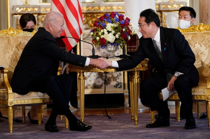 2022년 5월 일본 도쿄를 방문한 조 바이든 미국 대통령(왼쪽)이 미·일 정상회담에 앞서 기시다 후미오 일본 총리과 악수를 나누고 있다. AP연합뉴스 |