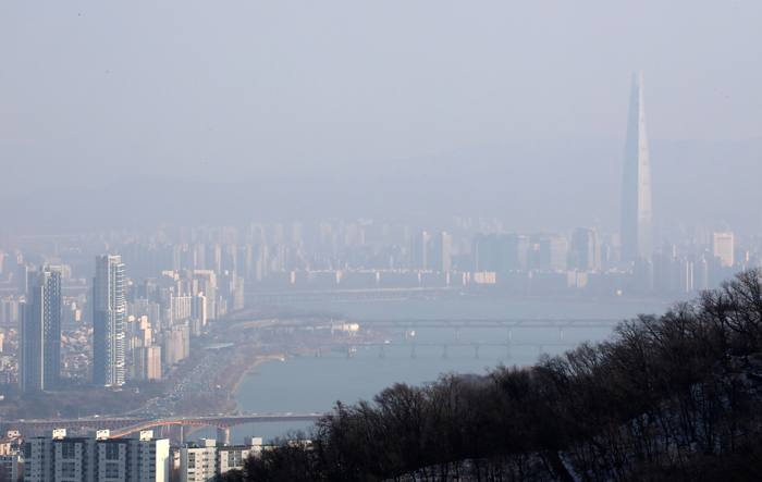 지난주를 꽁꽁 얼린 최강 한파가 물러간 지난 26일 오후 서울 하늘이 미세먼지로 뿌옇다. 미세먼지 농도는 서울, 인천, 경기, 강원 영서, 충청권, 광주, 전북은 ‘나쁨’, 나머지 지역은 ‘보통으로 예보됐다. [사진 출처 = 연합뉴스] |