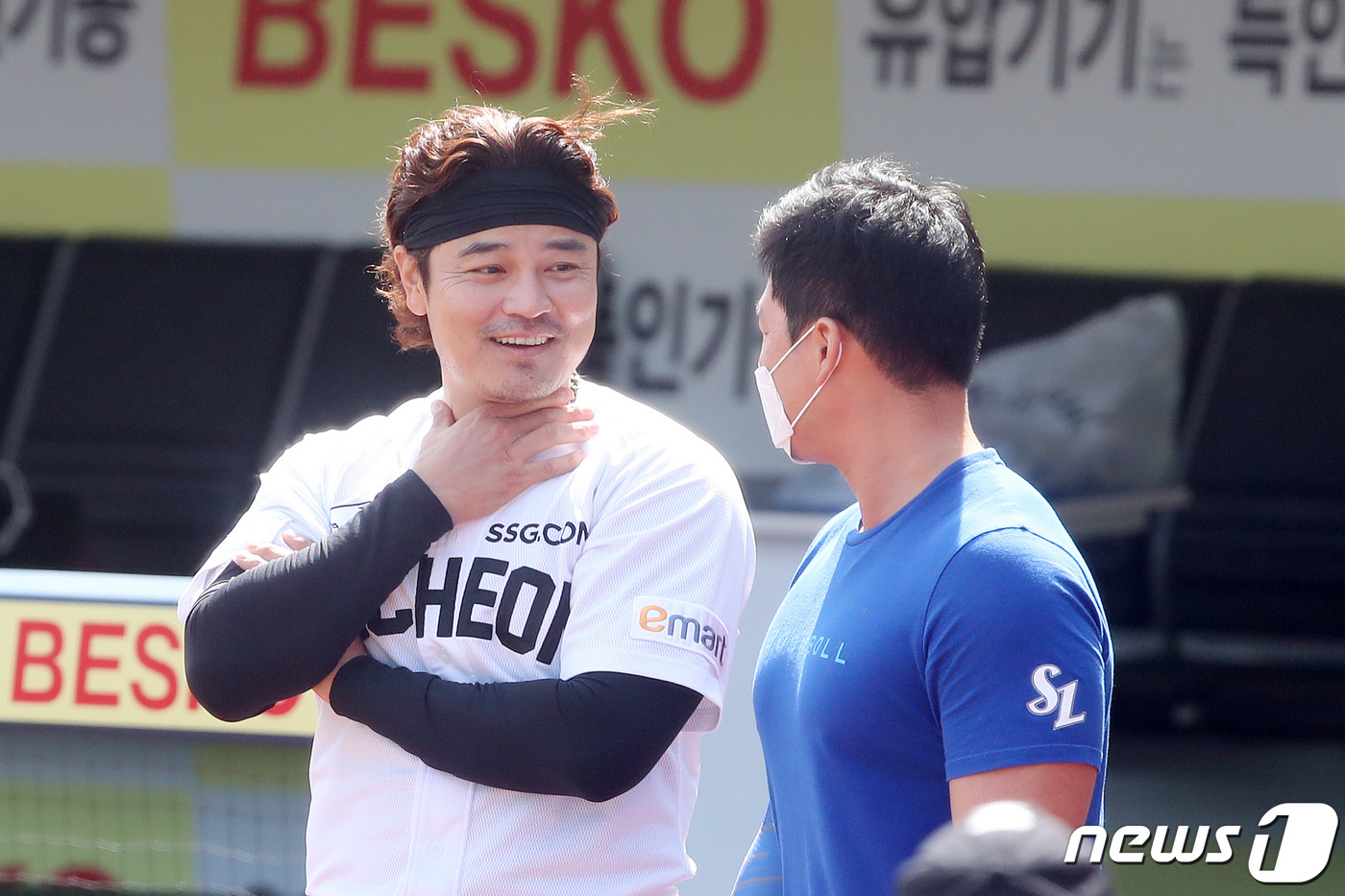 SSG 랜더스 추신수가 16일 오전 대구삼성라이온즈파크에서 팀 훈련에 앞서 삼성 오승환과 만나 미소를 짓고 있다. 2021.3.16/뉴스1 ⓒ News1 공정식 기자 |