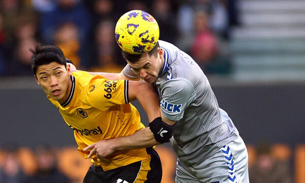 황희찬이 몸싸움을 해가며 공중볼을 다투고 있다. 울버햄프턴은 홈구장인 몰리뉴 스타디움에서 에버턴에 3-0으로 대승했다. 연합뉴스 |