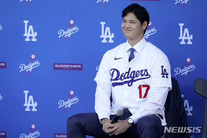 [로스앤젤레스=AP/뉴시스] 오타니 쇼헤이가 14일(현지시간) 미 캘리포니아주 로스앤젤레스 다저스타디움에서 열린 LA 다저스 입단 기자회견에 참석해 있다. 오타니는 10년 7억 달러(약 9079억 원)에 입단 계약을 맺었다. 2023.12.15. |