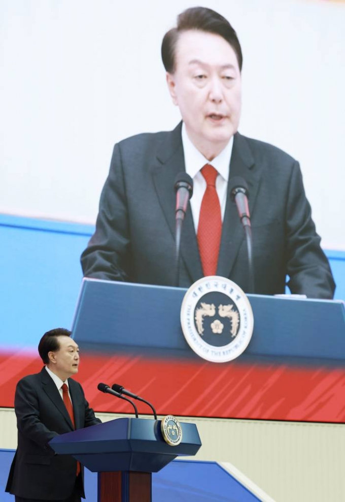 [서울=뉴시스] 전신 기자 = 윤석열 대통령이 2일 서울 영등포구 한국거래소에서 열린 2024 증권·파생상품시장 개장식에서 축사하고 있다. (대통령실통신사진기자단) 2024.01.02. |