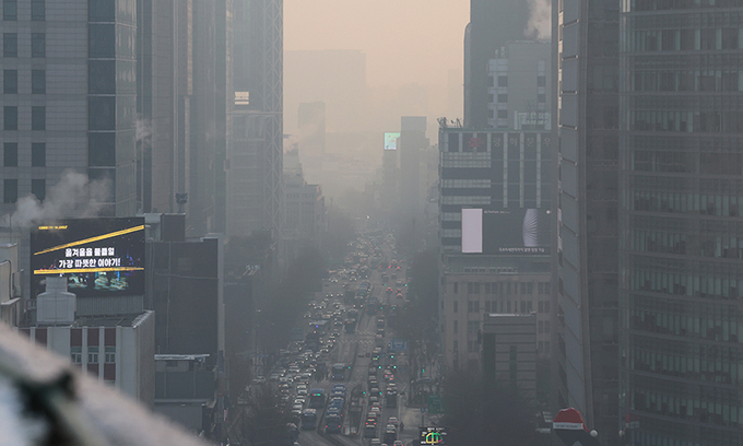 초미세먼지 농도가 '나쁨' 수준을 보인 10일 서울 종로구 일대가 뿌옇게 보이고 있다. 연합뉴스 |