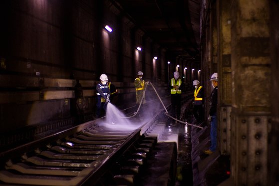 서울교통공사 직원들이 1일 오전 서울 지하철 1호선 시청역 인근 철로에서 미세먼지를 대비해 터널 청소를 하고 있다. [사진 서울교통공사] |