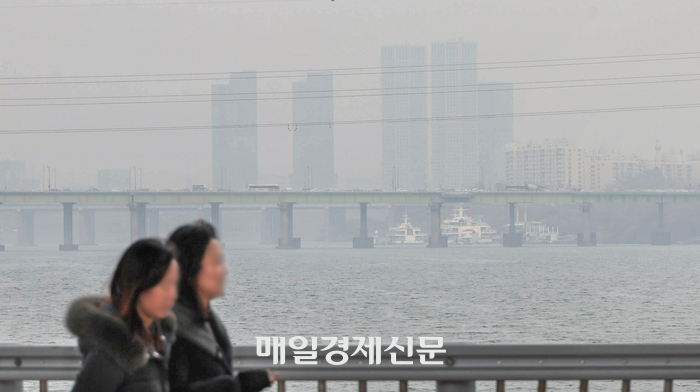 전국 초미세먼지 농도가 ‘나쁨’ 수준인 지난달 6일 서울 한강시잠수대교에서 시민들이 여가 활동을 하며 지나가고 있다. [이충우기자] |