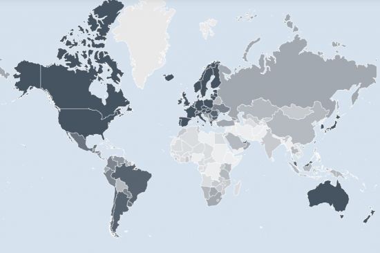 전 세계 지도로보는 세계 여권파워. 색깔이 진할수록 여권파워(무비자 입국 나라 숫자가 많다는 의미)가 세다. [이미지출처=헨리패스포트인덱스] |