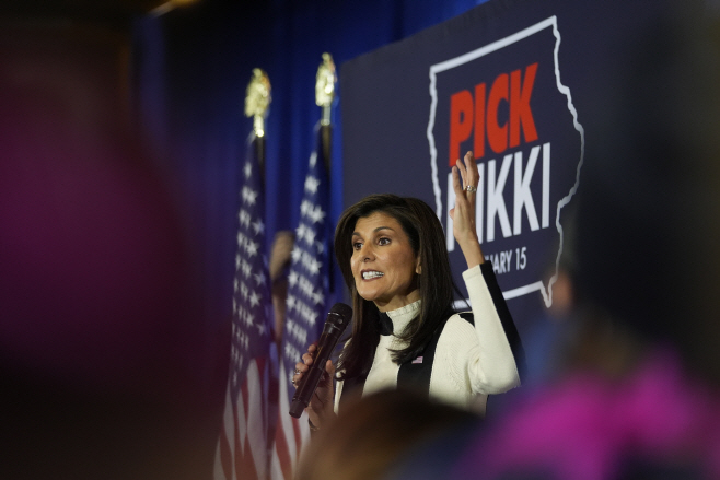 니키 헤일리 전 유엔주재 미국대사가 14일(현지시간) 아이오와주 에임즈에서 유세를 하고 있다./AP·연합뉴스 |