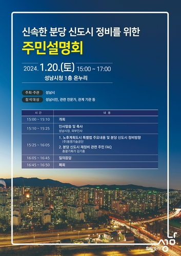 성남시는 오는 1월 20일 오후 3시 시청 1층 온누리에서 '신속한 분당신도시 정비를 위한 주민설명회'를 개최한다.