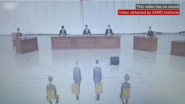 영상엔 16세 북한 청소년 두 명이 야외 경기장에서 수백명의 학생들 앞에서 서 있는 모습이 담겨 있다. 제복을 입은 경찰관은 북한 청소년에게 수갑을 채우고 "자기 잘못을 깊이 반성하지 않는다"고 질책한다.