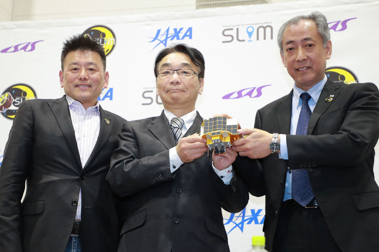 일본 탐사선 ‘슬림’이 달 착륙에 성공한 20일 야마카와 히로시(오른쪽) JAXA 이사장 등이 기자회견에서 포즈를 취하고 있다. [AFP연합] |