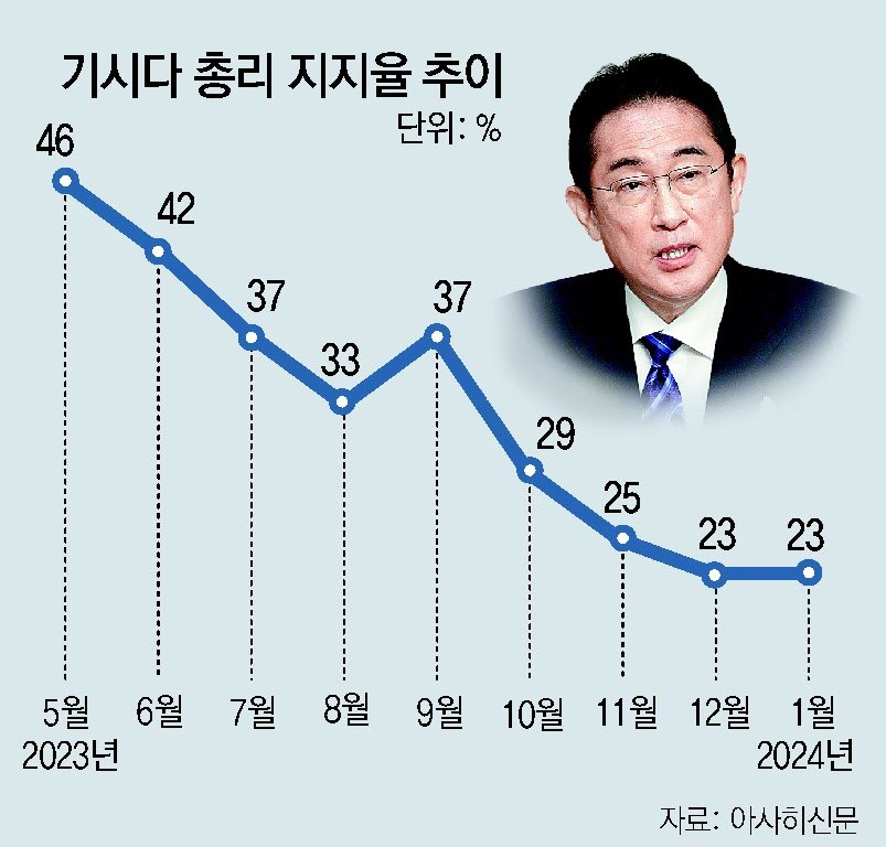 22일 아사히신문이 발표한 여론조사 결과에 따르면 기시다 총리 지지율은 23%로 1개월 전과 같은 수준이었다. 같은 날 요미우리신문 여론조사에서는 지난해 12월보다 1%포인트 하락한 24%로 기시다 총리 취임 이후 최저 수준을 기록했다. 일본에서는 총리 지지율이 20% 안팎이면 정권 퇴진 수준으로 평가된다.