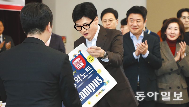 “운동권 정치인에겐 미안하지 않지만 청년들에겐 죄송” 국민의힘 한동훈 비상대책위원장(가운데)이 24일 서울 동작구 숭실대에서 열린 ‘함께하는 대학생의 미래’ 현장간담회에 참석해 ‘대학생공약노트’를 전달받고 있다. 한 위원장은 이날 “더불어민주당 운동권 세력은 제가 운동권 정치인에게 죄송한 마음을 가져야 한다고 하는데 미안한 마음은 전혀 없다”며 “그렇지만 청년 여러분께는 죄송한 마음이 매우 크다”고 말했다. 이훈구 기자 ufo@donga.com |