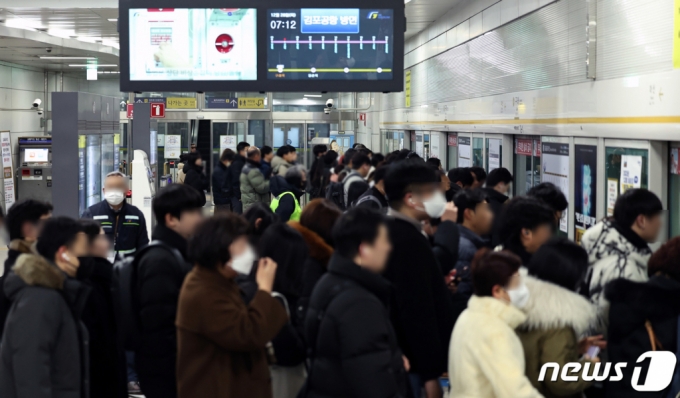 (김포=뉴스1) 구윤성 기자 = 28일 오전 경기 김포시 김포골드라인 구래역에서 출근길에 오른 시민들이 열차를 기다리고 있다. 2023.12.28/뉴스1 Copyright (C) 뉴스1. All rights reserved. 무단 전재 및 재배포, AI학습 이용 금지. |