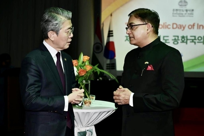 지난 26일 아밋 쿠마르 주한 인도대사(오른쪽)와 김홍균 외교부 제1차관(왼쪽)이 제75회 인도 공화국의 날 기념 리셉션에 참석해 대화하고 있다. [사진제공=주한 인도대사관] |