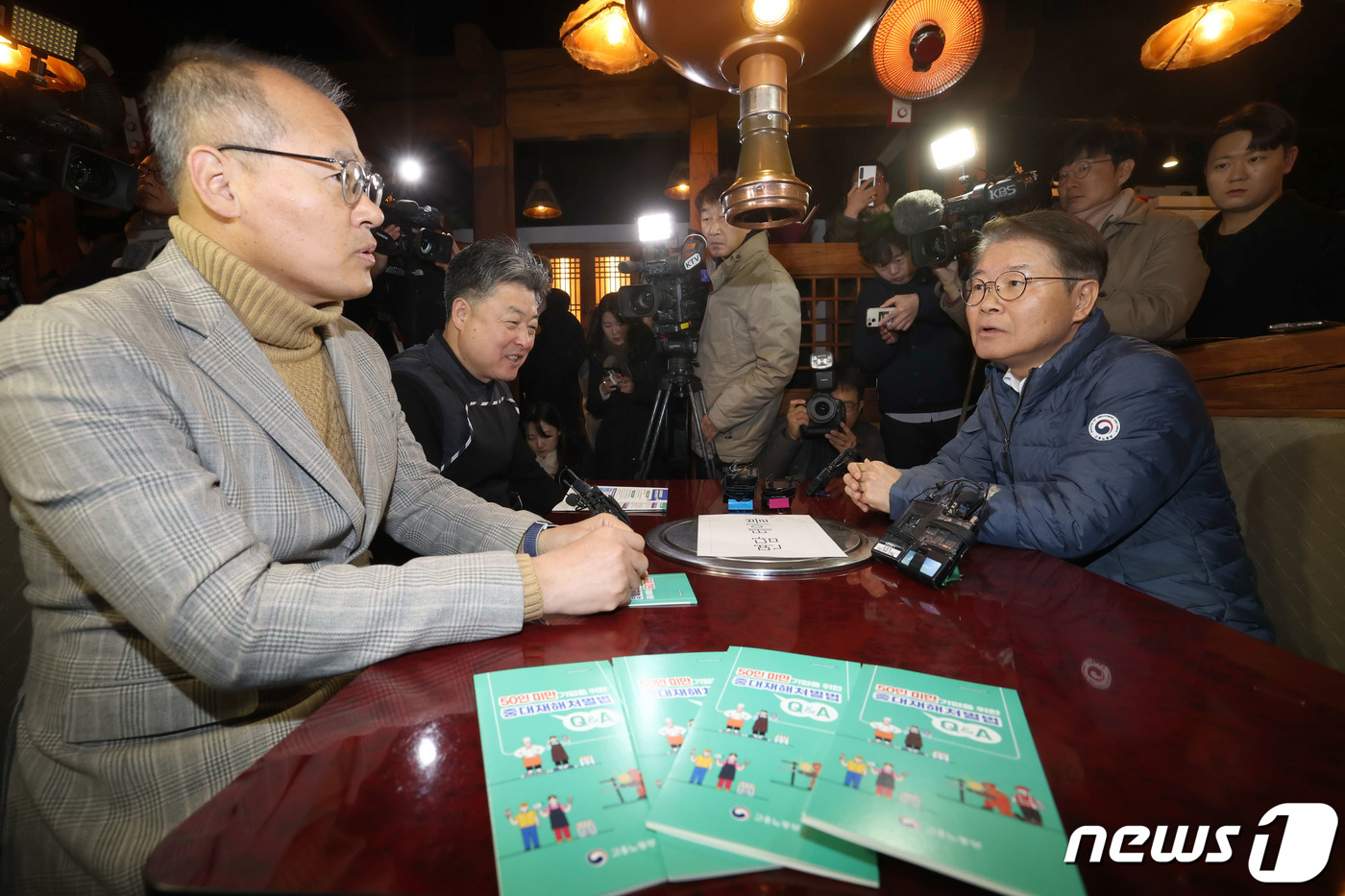 (서울=뉴스1) 박정호 기자 = 이정식 고용노동부 장관(오른쪽)이 29일 오전 중소영세기업 중대재해처벌법 적용 관련 사업장 순회로 서울 중구 명동의 한 음식점을 방문, 소규모 서비스업 사업장 대표들과 면담하고 있다. (공동취재) 2024.1.29/뉴스1