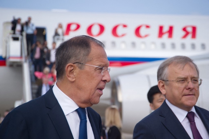 세르게이 라보로프 러시아 외교부 장관(왼족)과 알렉산드르 마체고라 주북한 러시아 대사가 2018년 3월 평양 국제공항을 찾은 모습./AFPBBNews=뉴스1 |