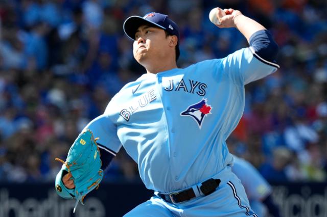 류현진이 2023년 10월 1일(한국시간) 캐나다 온타리오주 토론토의 로저스 센터에서 열린 2023 메이저리그(MLB) 탬파베이 레이스와의 경기에 선발 등판해 1회 초 투구하고 있다. 토론토=AP 뉴시스 |