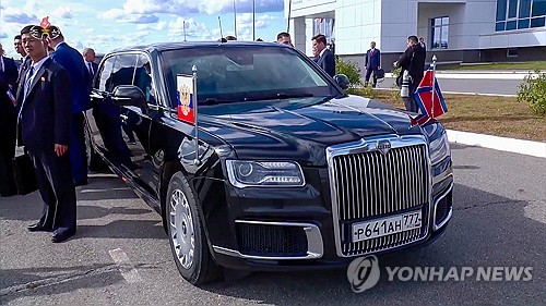 푸틴 전용차 '아우루스'에 승차한 김정은 |