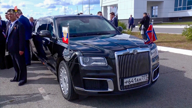 김정은 북한 국무위원장이 지난해 9월 러시아 아무르주의 보스토치니 우주기지를 방문했을 때 블라디미르 푸틴 러시아 대통령의 전용차에 함께 승차해 담화를 나누었던 아우루스./조선중앙TV 화면·연합뉴스 |