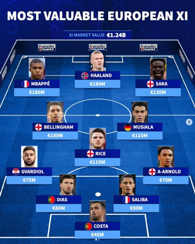 축구 통계 전문 매체 '트랜스퍼마크트'는 23일(이하 한국시간) 공식 SNS에 유럽에서 가장 몸값이 높은 선수들 베스트11을 공개했다. 유럽 국적 선수들만 포함됐다.