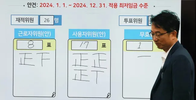 지난해 7월19일 정부세종청사 최저임금위원회 회의실 모니터에 내년 적용 최저임금 표결 결과가 게시돼 있다. 연합뉴스 |