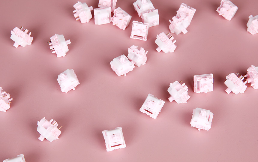 '딸기케이크' 리니어 키보드 스위치는 걸림이 적은 깔끔한 리니어 스위치로, 로우 피치의 부드러운 타건음으로 사무용으로 쓰기에도 적절한 스위치이다.