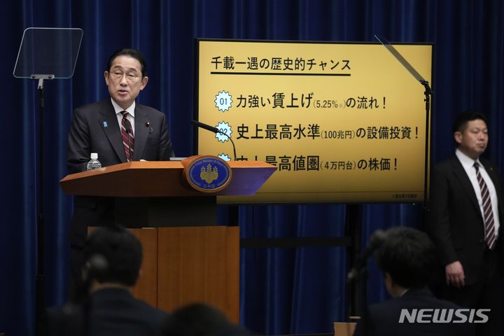 [도쿄=AP/뉴시스]기시다 후미오(岸田文雄) 일본 총리가 28일 도쿄에서 기자회견을 갖고 있다. 기시다 총리는 올해 안에 반드시 물가 상승을 뛰어넘는 임금 인상을 실현하고, 내년부터는 이를 정착시키겠다고 약속했다. 2024.03.28. |