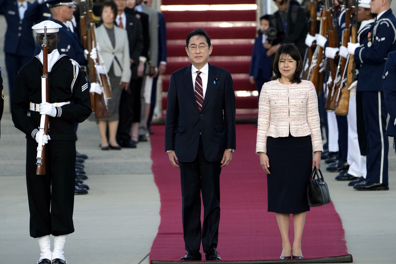 8일(현지시간) 기시다 후미오 일본 총리와 부인 기시다 유코 여사가 미국 메릴랜드주 앤드루스 합동기지에 도착했다. [AP] |