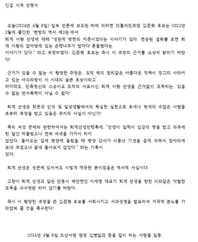 그러면서 "고향이 퇴계 선생과 같은 안동시 예안면인 이재명 (더불어민주당) 대표가 퇴계 선생을 향한 이와 같은 악랄한 모독을 수수방관하지 않기를 바란다"며 "즉시 이 황당한 주장을 쓴 김 후보를 사퇴시키고 사과 성명을 발표해 거국적 분노를 가라앉혀 줄 것을 촉구한다"고 강조했다.