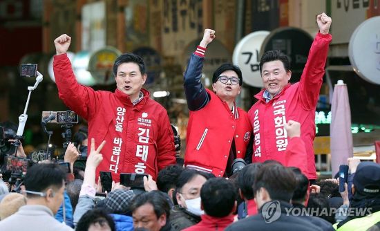 국민의힘 한동훈 비상대책위원장이 26일 오후 경남 양산시 양산남부시장을 찾아 같은 당 김태호, 윤영석 후보 지지를 호소하고 있다. [사진출처=연합뉴스] |