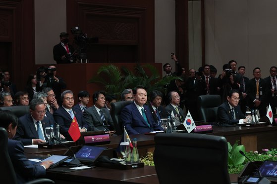 지난해 9월 6일 인도네시아 자카르타에서 열린 아세안(동남아시아국가연합)+3 정상회의에 첨석한 리창 중국 총리와 한국 윤석열 대통령, 기시다 후미오 일본 총리(완쪽부터). 대통령실 제공=뉴스1 |