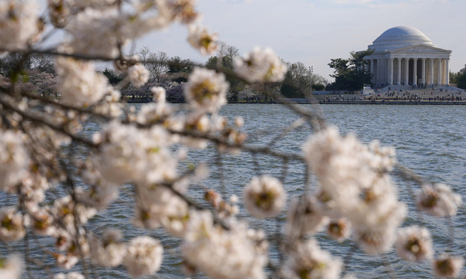 지난 3월 제퍼슨 기념관 앞 타이달 베이슨 근처에 벚꽃이 흐드러지게 피어있다. 1912년 윌리엄 하워드 태프트 대통령 시절 일본이 미국에 기증한 벚나무다. 워싱턴=AP 연합뉴스 |