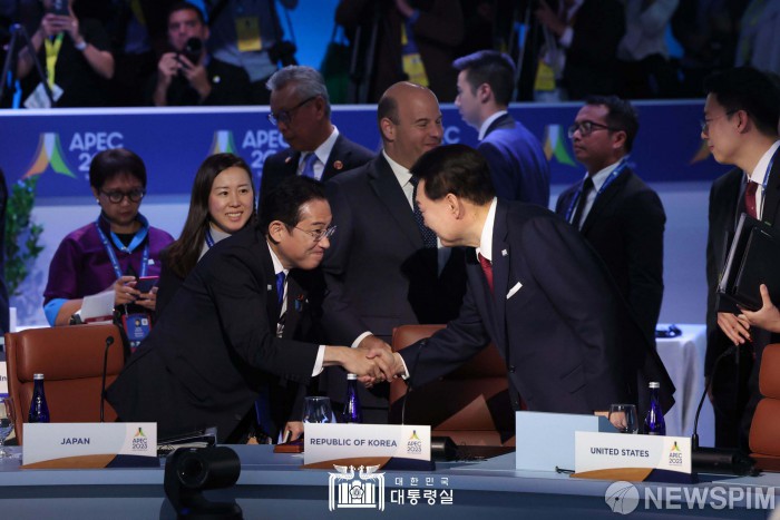 [서울=뉴스핌] 윤석열 대통령이 17일(현지시간) 미국 샌프란시스코 모스코니센터에서 열린 아시아태평양경제협력체(APEC) 정상회의 제2세션 리트리트에서 기시다 후미오 일본 총리와 인사하고 있다.[사진=대통령실] 2023.11.18 photo@newspim.com |