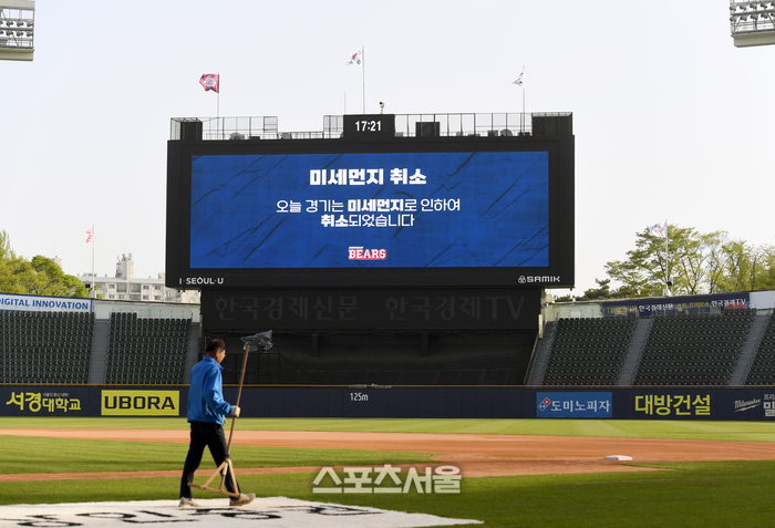 2023년 4월 12일 잠실구장에서 열릴 예정이던 2023 KBO리그 두산 베어스와 키움 히어로즈의 경기가 미세먼지로 인해 취소된 가운데 안내 메시지가 전광판에 표출되고 있다. 잠실 | 박진업기자 upandup@sportsseoul.com |