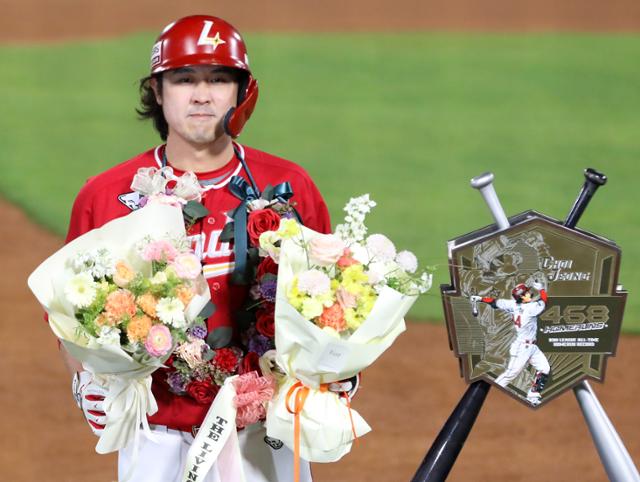 최정은 24일 부산 사직구장에서 열린 롯데와 원정 경기에서 프로야구 역사를 새로 썼다. 팀이 4-7로 끌려가던 5회초 2사 주자 없는 상황에서 상대 선발 이인복의 초구 커터를 받아 쳐 왼쪽 담장을 넘기는 솔로포로 연결했다. 시즌 10호이자, 역대 최초의 개인 통산 468번째 대포다. 새 역사의 한 페이지를 장식한 최정은 묵묵히 그라운드를 돌았다. 대기록 달성에 대한 압박감을 훌훌 털어내서 그런지 편안한 표정이다.