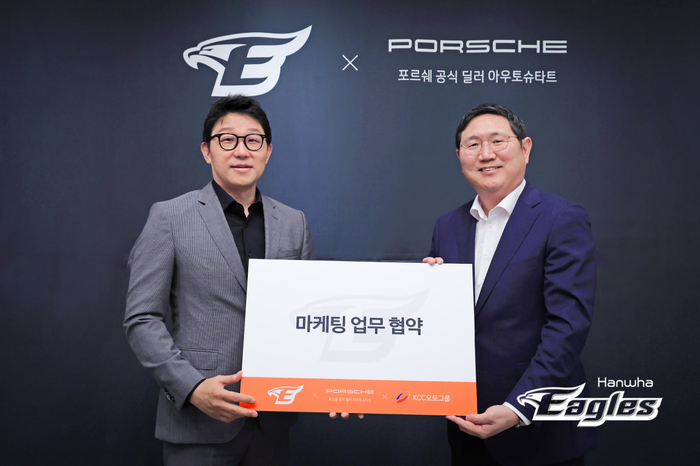한화는 2일 대전 한화생명이글스파크 내 홍보관에서 포르쉐 공식 딜러사인 아우토슈타트(KCC오토그룹)와 후원 협약을 체결, 2024시즌 홈 경기 불펜카 운영을 지원받고 다양한 협업 방안을 추진하기로 했다.