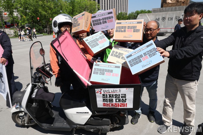 [서울=뉴스핌] 김학선 기자 = 민주노총 공공운수노조 조합원들이 8일 서울 광화문 광장에서 열린 최저임금 투쟁 계획 발표 기자회견에서 최저임금 확대적용 및 대폭인상을 촉구하는 퍼포먼스를 하고 있다. 2024.05.08 yooksa@newspim.com