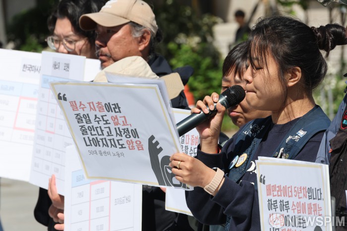 [서울=뉴스핌] 김학선 기자 = 민주노총 공공운수노조 조합원들이 8일 서울 광화문 광장에서 열린 최저임금 투쟁 계획 발표 기자회견에서 최저임금 확대적용 및 대폭인상을 촉구하고 있다. 2024.05.08 yooksa@newspim.com