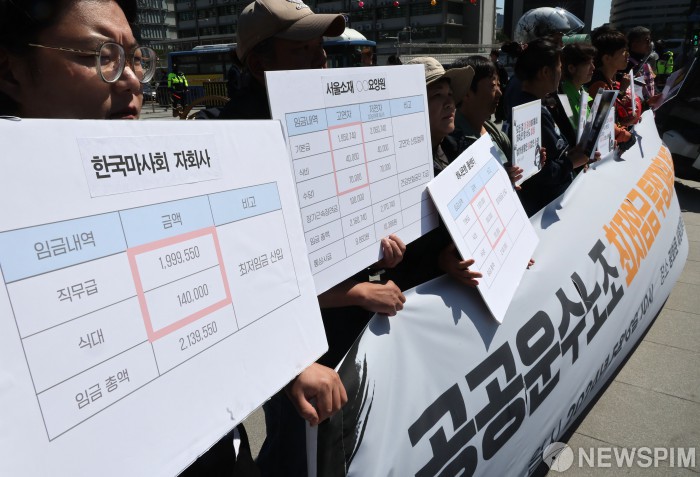 [서울=뉴스핌] 김학선 기자 = 민주노총 공공운수노조 조합원들이 8일 서울 광화문 광장에서 열린 최저임금 투쟁 계획 발표 기자회견에서 최저임금 확대적용 및 대폭인상을 촉구하고 있다. 2024.05.08 yooksa@newspim.com