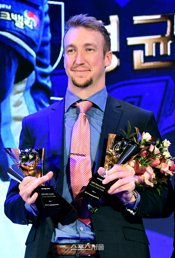 NC 다이노스 페디가 27일 서울 중구 웨스틴조선서울 그랜드볼룸에서 진행된 2023 KBO 시상식에서 평균자책점-승리-탈삼진상 3관왕에 오른 뒤 기념촬영을 하고 있다. 박진업기자 upandup@sportsseoul.com |