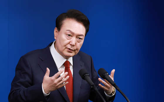 윤석열 대통령이 9일 오전 서울 용산 대통령실 청사 브리핑실에서 열린 '윤석열정부 2년 국민보고 및 기자회견'에서 질문에 답하고 있다. 〈사진=연합뉴스〉 |