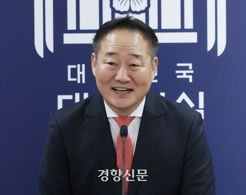 대통령실 시민사회수석에 임명된 전광삼 전 시민소통비서관이 10일 서울 용산 대통령실 청사에서 소감을 말하고 있다. 김창길 기자 |