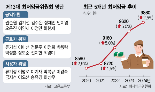 ◇올해 최저임금 2.5% 인상···고물가가 최대 변수=내년 최저임금 수준 심의의 최대 변수는 올해에 이어 내년에도 최저임금 인상폭이 낮게 결정되느냐다. 올해 최저임금은 전년 보다 2.5% 올랐는데 이는 역대 두번째로 낮은 폭이다. 인상폭이 가장 낮았던 2021년 1.5% 인상률은 2018년과 2019년 각각 16.4%, 10.9% 오른 데 따른 일종의 충격 완화 성격을 띠었다.