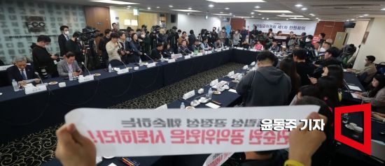 18일 서울 중구 프레스센터에서 열린 최저임금위원회 1차 전원회의가 박준식 최저임금위원회 위원장 등 공익위원들이 회의에 참석하지 않아 파행되고 있다. 박 위원 등 공익위원들은 회의장 내 노동계 관계자들이 최저임금 인상을 촉구하는 피켓을 들고 서 있는 상황을 문제 삼으며 회의에 참석하지 않았다. 사진=윤동주 기자 doso7@ |
