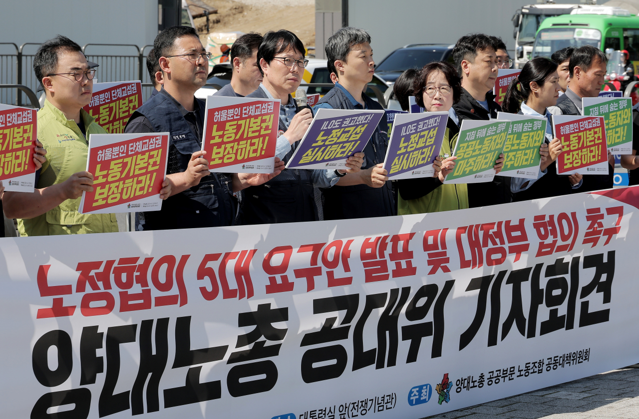 양대노총 공공부문 노동조합 공동대책위원회 관계자들이 13일 오전 서울 용산구 대통령 집무실 앞에서 노정협의 5대 요구안 발표 기자회견을 하고 있다. 이들은 기자회견을 통해 노정 교섭 촉구와 함께 민영화 저지 및 공공성 강화, 직무성과급 임금체계 개편 중단, 공공부문 청년 일자리 확대, 공공부문 실질임금 인상, 공공부문 비정규직 차별 해소 등의 5대 요구안을 발표했다. [연합] |