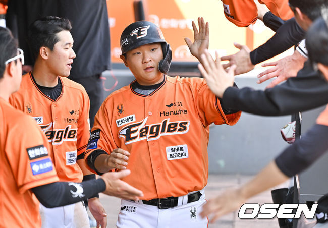 [OSEN=대전, 박준형 기자] 한화 김태연이 홈을 밟은뒤 동료들의 축하를 받고 있다. 2024.05.12 / soul1014@osen.co.kr |