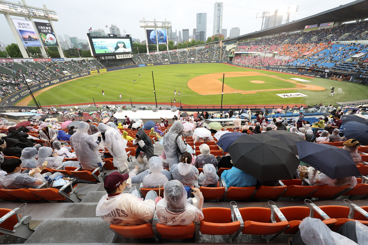 15일 오후 서울 송파구 잠실야구장에서 열린 2024 프로야구 키움 히어로즈와 LG 트윈스의 경기. 경기를 앞두고 시민들이 우산을 쓰고 비를 피하고 있다. [연합] |