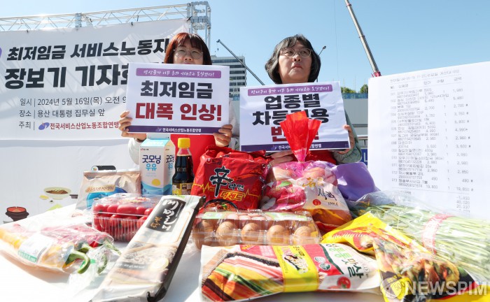 [서울=뉴스핌] 이호형 기자 = 전국서비스산업노동조합연맹 (서비스연맹)이 16일 오전 서울 용산구 전쟁기념관 앞에서 최저임금으로 장보기 기자회견을 연가운데 손 피켓 시위를 하고 있다. 2024.05.16 leemario@newspim.com
